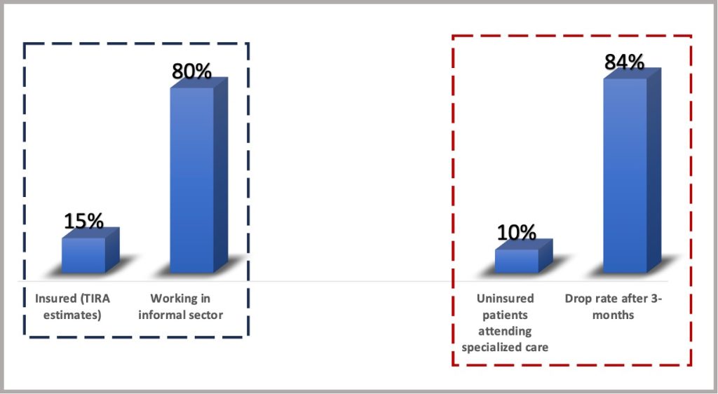 Specialized clinics, though essential, are largely attended by insured clients, with less than 10% of patients being uninsured. Among these few, 84% drop out of care within three months, unable to afford continued consultations, investigations, or medications. This silent exodus reflects a deeper inequality where access to long-term care is shaped not by medical need, but by financial means.
